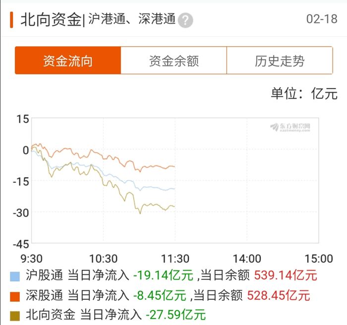 但在今日早盘,北向资金出现净流出。截至午间收盘,以使用额度余额计,北向资金共计净卖出27.59亿元;以实际成交计,北向资金净卖出29.13亿元。其中,沪股通净卖出额大于深股通净卖出额。