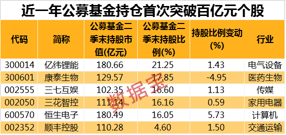 虽然大多数行业遭公募基金减仓,但是从持仓市值来看,今年二季末共有34股持仓市值超百亿,上一期为24只。