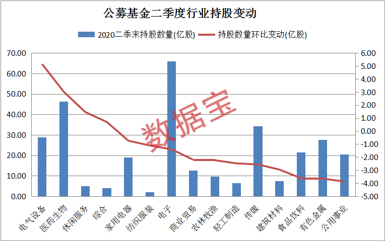 证券时报·数据宝统计显示,与一季末相比,二季度仅有4个行业获得公募基金加仓,分别是电气设备、医药生物、休闲服务及综合行业,前3行业加仓股数量均超过1亿股,其中电气设备获加仓5.16亿股,医药生物获加仓3.03亿股。减仓股数量居前的行业有银行、建筑装饰、房地产,其中前2个行业减仓股数量均超过10亿股。传统行业如公用事业、采掘等减仓股数量均超过3.5亿股。