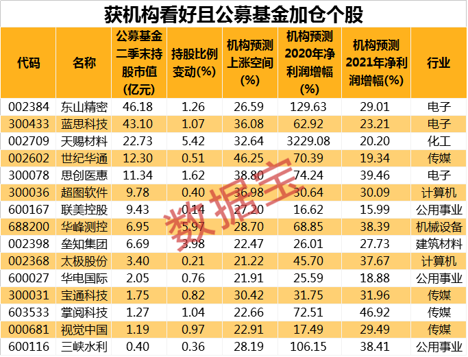 数据宝统计发现,满足公募基金环比加仓超0.1%、评级机构超10家、机构预测今明两年净利润增幅超15%、上涨空间超20%的公司仅有15家,主要分布在电子、传媒及公用事业3行业。