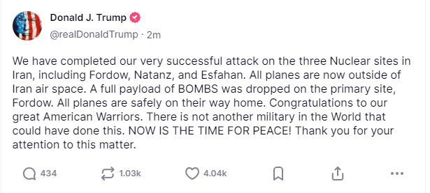 当地时间6月21日,美国总统特朗普在其社交媒体“真实社交”上发文称,美国已完成对伊朗福尔多、纳坦兹和伊斯法罕三处核设施的袭击。