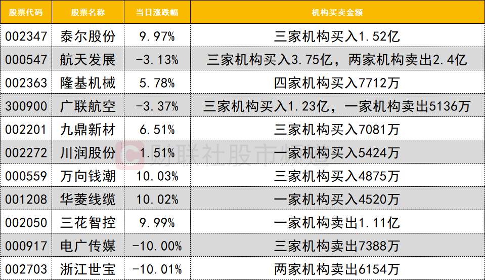 今日龙虎榜机构活跃度较高,商业航天概念今日整体冲高回落,多只概念股获机构买入,其中4连板的泰尔股份获三家机构买入1.52亿;航天发展获三家机构买入3.75亿,同时遭两家机构卖出2.4亿;隆基机械获四家机构买入7712万;广联航空获三家机构买入1.23亿,同时遭一家机构卖出5136万。