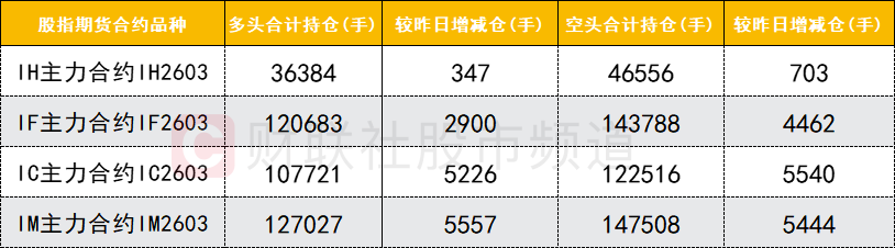 四大期指主力合约中,IH、IF、IC、IM合约多空双方均加仓,IF合约空头加仓数量较多。