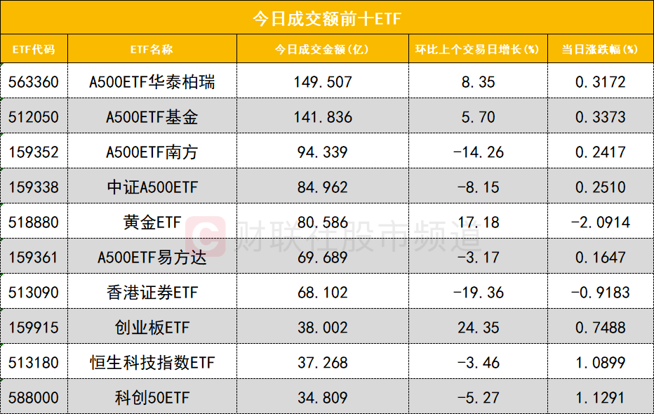 从成交额前十的ETF来看,A500ETF华泰柏瑞(563360)成交额位居首位,A500ETF基金(512050)成交额位居次席。