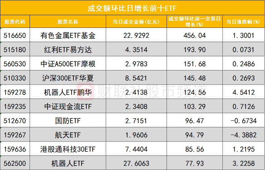 从成交额环比增长前十的ETF来看,有色金属ETF基金(516650)成交额环比增长456%位居首位;红利ETF易方达(515180)成交额环比增长193%位居次席。