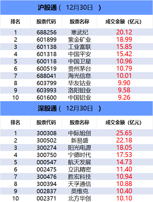 从沪股通前十大成交个股来看,寒武纪位居首位;紫金矿业和工业富联分居二、三位。