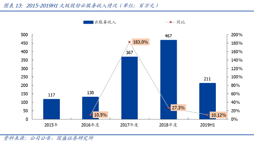 2016年-2018年,公司云服务相关收入分别为1.3亿元、3.67亿元和4.67亿元,2015-2018年期间云服务收入的年复合增长率达到58.5%,实现了较快增长。截至目前,公司的政务云运营服务包括北京、海南、海口、山西等地,2019年初太极成功中标天津市政务云,将助力天津市构建政务云运营和服务体系,为天津市各政府部门提供政务云服务。截至2018年末,太极政务云已经承载近200个政务部门的业务系统运行,涉及政务服务、医疗卫生、科研教育、交通运输、公共服务、人力社保、食品监督、新闻出版等领域。