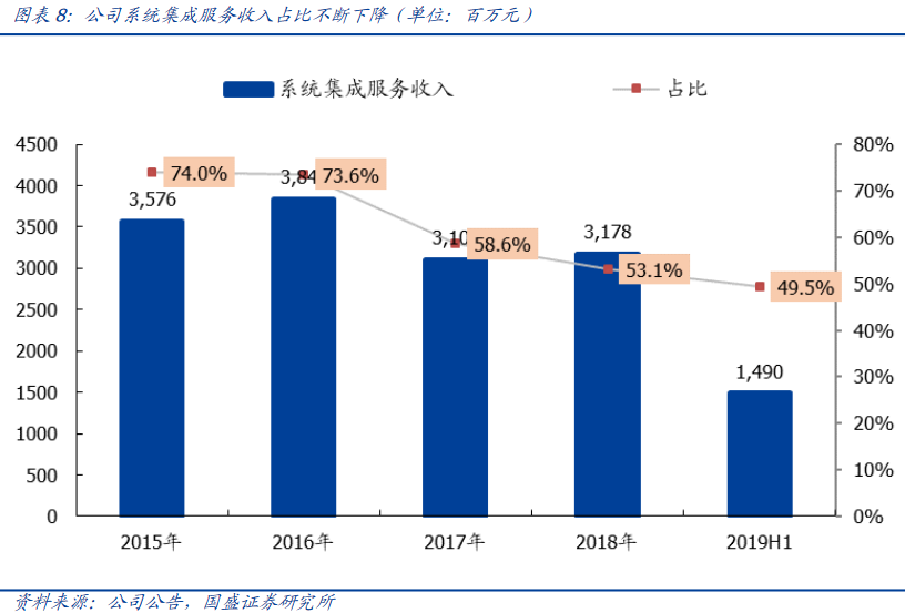 系统集成业务仍为主要收入来源,但占比持续下降。随着信息技术演进以及用户需求不断变化,公司传统硬件集成业务逐渐向应用和软件集成业务转变,业务结构持续优化,产业链向后端延伸。2019年上半年,公司的系统集成服务业务实现收入14.90亿元,同比减少7.13%,占比下降至49.5%。公司系统集成服务业务主要应用于党政军和公共事业,目前已为全国人大、全国政协、国务院办公厅、发改委和审计署等数十个国家部委以及科研、媒体、医疗和教育等公共事业部门提供行业解决方案。