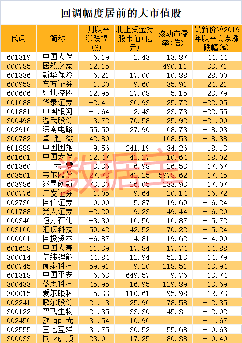 数据显示,在上述61只业绩有望大增的大市值股中,32股较2019年以来高点回落10%以上,其中8股回落幅度超过20%,分别是中国人保、居然之家、新华保险、东方证券、绿地控股、华泰证券、中国银河、温氏股份。中国人保回落幅度最高,回落幅度达到44.44%。公司预计去年净利润为215.2亿元至242.1亿元,同比增长60%至80%。具体回调情况见下表: