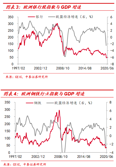 我们同样考察了欧洲,结果也是如此。欧洲银行、钢铁以及能源等周期行业的股票走势与经济周期也基本一致。