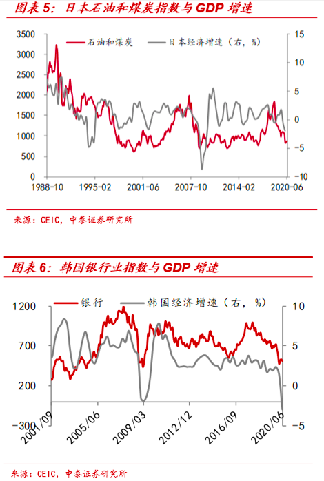 日本和韩国等经济体的情况也是如此,即周期股与经济周期走势也是基本一致的。