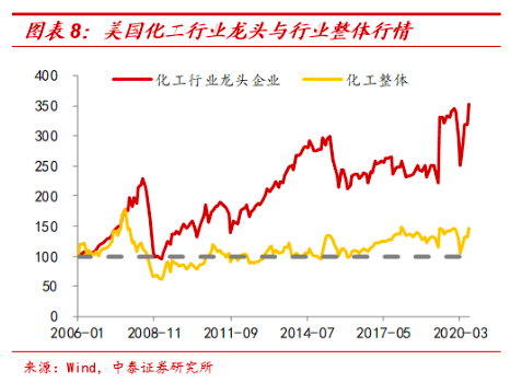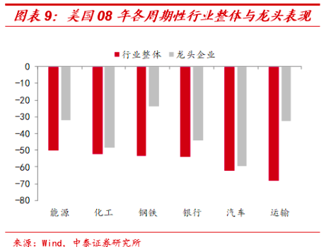 以美国为例,2007年美国经济进入衰退期,周期行业整体走弱,但是龙头企业表现相对较好。比如2008年钢铁行业整体下跌了53%,但龙头企业仅下跌24%。能源行业2008年整体下跌50%,龙头企业下跌32%。银行业2008年整体下跌了54%,龙头企业下跌44%。其他周期行业龙头在衰退期的表现大多也是好于行业整体的。而且,从2008年至今,龙头类周期股的表现也要明显好于非龙头股。