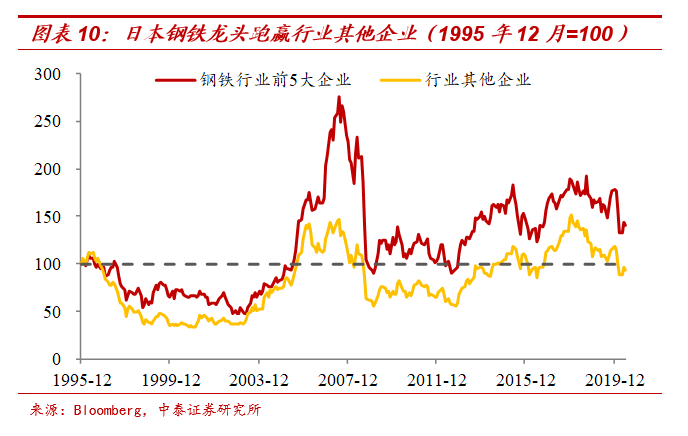 比如日本的钢铁行业,前五大上市钢企的行情是一直跑赢行业内其他企业的,在将近25年的时间里,龙头钢企还能有40%的收益率,非龙头企业却几乎零收益。