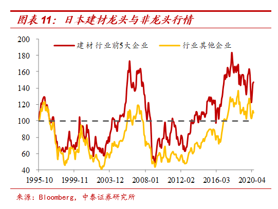日本经济从上世纪90年代起进入长期低迷期,周期股整体行情再也没回到上世纪90年代初的高峰,但龙头企业的表现仍要比非龙头好一些。