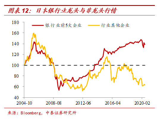 日本的建材和银行业也呈现出类似的特征:龙头表现优于非龙头。1995年以来,持有建材行业的龙头有将近50%的收益,非龙头企业只有不到10%的收益率。从2004年至今银行业龙头也有38%的收益,但非龙头企业反而亏损了40%。