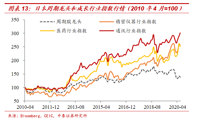 我们选取了日本钢铁、建材、银行、传统能源和地产行业中的前五大企业,发现周期股龙头虽然能有正的收益率,但仍然没法超越医药、通信、精密仪器等新经济行业的表现。