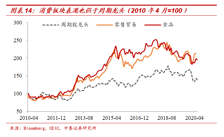 日本的周期龙头也没能跑赢消费板块。这也意味着,在传统经济周期下行的阶段,与其投资周期股龙头,不如选择成长和消费。
