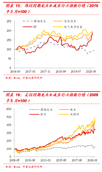 我们同样考察了韩国和美国的情况,结果也是类似的。例如,过去十多年美股大牛市,周期龙头几乎一分未涨,技术、医疗、互联网等领域却不断创新高。
