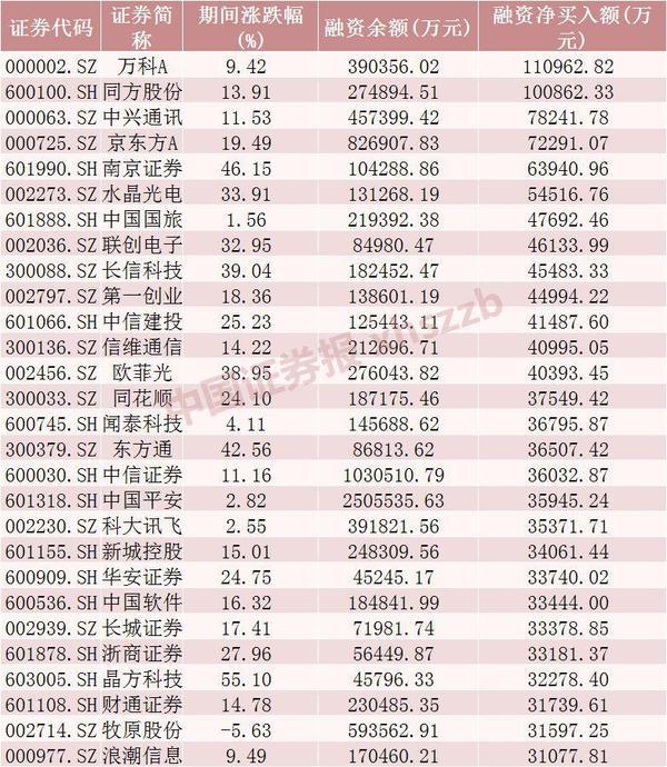 个股来看,融资客偏爱科技股和券商股。数据显示,截至12月18日,12月份以来融资客加仓金额居前的个股分别为万科A、同方股份、中兴通讯、京东方A、南京证券、水晶光电等,分别加仓11.10亿元、10.09亿元、7.82亿元、7.23亿元、6.39亿元、5.45亿元。从期间涨幅情况来看,这些个股无一下跌,全部上涨,其中南京证券累计上涨46.15%,水晶光电上涨33.91%,涨幅最小的万科A期间上涨了9.42%。