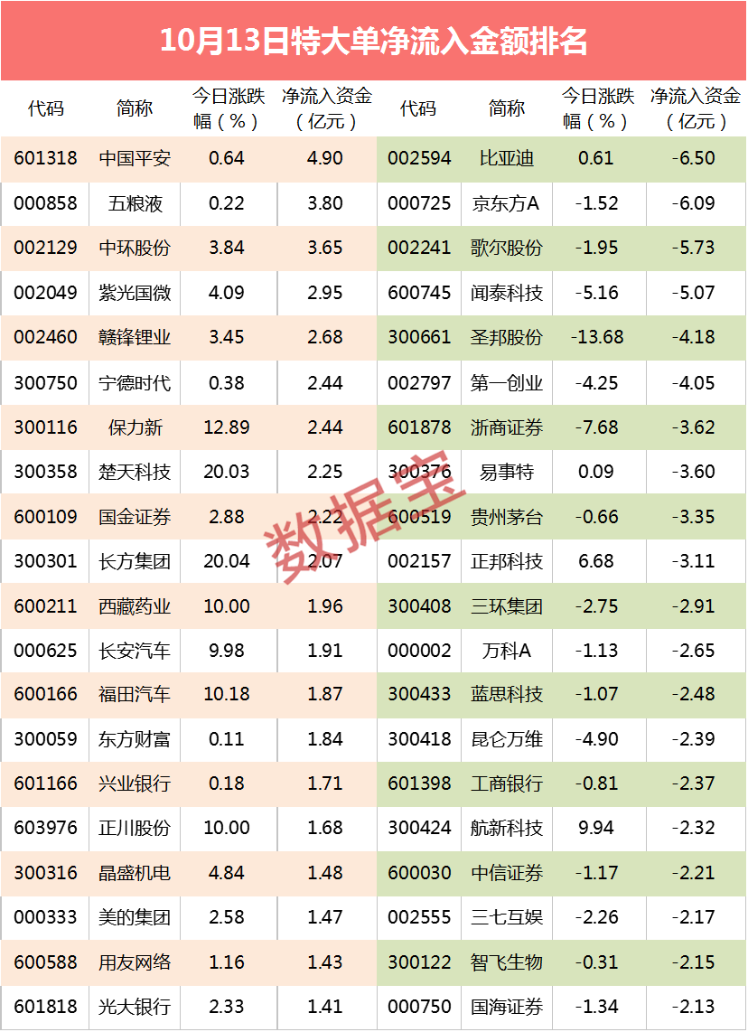 47股大单资金流出超亿元。比亚迪大单资金流出居首,净流出6.5亿元,股价小幅收涨但仍创出历史新高,公司昨日公告上调三季报业绩预期,预期归母净利润修正至34亿元-36亿元,同比增长幅度也增至115.97% -128.67%。9月1日以来,短短一个多月时间,比亚迪已累计上涨51%,今年以来,比亚迪股价累计上涨170%。截至最新,比亚迪总市值超过3300亿元,在汽车行业中仅次于宁德时代,超上汽集团市值近千亿。