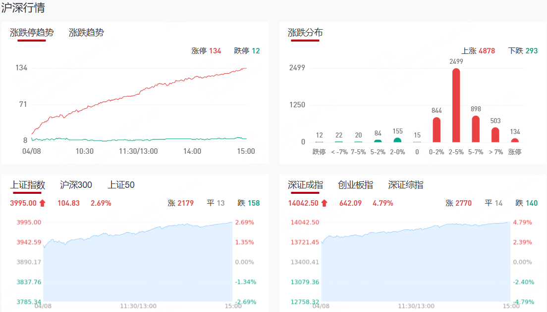 市场集体反弹,沪指百点长阳,创业板指涨近6%、科创50指数涨超6%。量能明显放大,沪深两市成交额2.43万亿,较上一个交易日放量8201亿。盘面上,市场热点快速轮动,全市场超5100只个股上涨,其中135只个股涨停,连续两日超百股涨停。从板块来看,AI产业链集体爆发,其中算力租赁概念走强,大位科技、行云科技、奥瑞德、杭钢股份、华孚时尚涨停。算力硬件概念快速拉升,中际旭创涨超10%,刷新历史高点,铭普光磁、东山精密、沪电股份、深南电路等多股涨停。AI应用端表现活跃,十余只成分股涨停,蓝色光标20cm涨停,志晟信息30cm涨停。贵金属概念集体走高,湖南黄金、四川黄金、西部黄金涨停。下跌方面,油气概念集体调整,中曼石油、贝肯能源、蓝焰控股跌停。