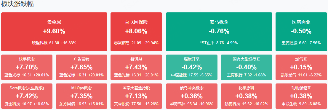 板块方面,贵金属、AI应用、算力产业链等板块表现活跃,每天、银行、医药商业等板块表现落后。截至收盘,沪指涨2.7%,深成指涨4.79%,创业板指涨5.91%。