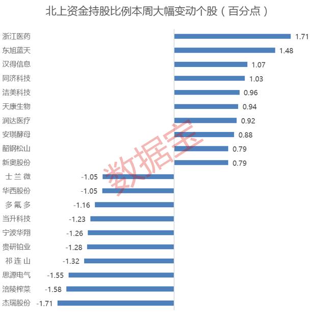 本周北上资金加仓股共735只,加仓比例超0.5个百分点的有66只。具体来看,浙江医药加仓比例最为明显,最新持股比例4.58%,环比增加1.71个百分点;其次是东旭蓝天,持股比例环比增加1.48个百分点;其他加仓比例靠前的还有汉得信息、同济科技、洁美科技、天康生物、润达医疗等。