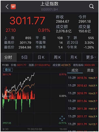 股民沸腾了!下半年首个交易日,上证指数小幅高开后一路上探,早盘收涨0.91%,收于3011.77点,自今年3月11日以来重新站上3000点大关。深证成指上涨1.02%,站上12000关口,创业板指数小幅回调,下跌0.36%。房地产、休闲服务、食品饮料行业涨幅居前。