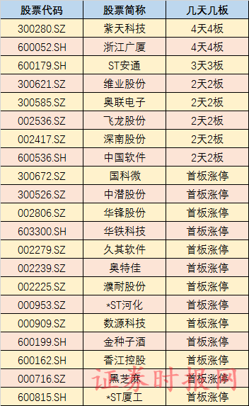值得注意的是,在前期热门股打开涨停板的情况下,新的连板个股又浮出了水面。数据显示,截至目前,紫天科技、浙江广厦已经4连板,期间累计涨幅接近50%,维业股份、奥联电子、飞龙股份、深南股份、中国软件等2连板。