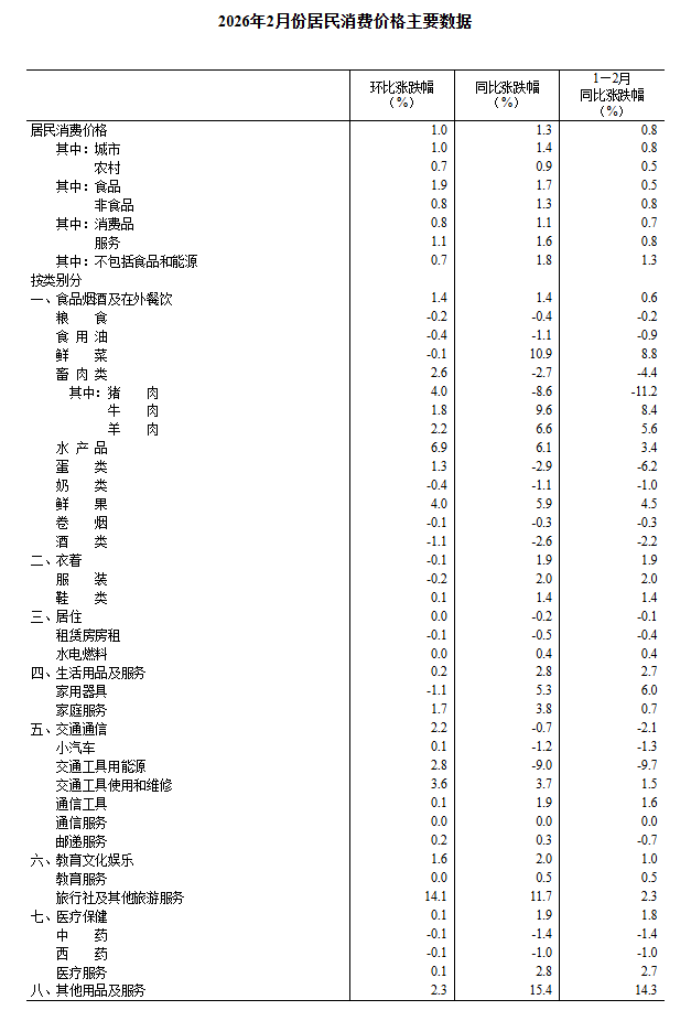 国家统计局数据显示,2026年2月份,全国居民消费价格同比上涨1.3%。其中,城市上涨1.4%,农村上涨0.9%;食品价格上涨1.7%,非食品价格上涨1.3%;消费品价格上涨1.1%,服务价格上涨1.6%。1—2月平均,全国居民消费价格比上年同期上涨0.8%。2月份,全国居民消费价格环比上涨1.0%。其中,城市上涨1.0%,农村上涨0.7%;食品价格上涨1.9%,非食品价格上涨0.8%;消费品价格上涨0.8%,服务价格上涨1.1%。