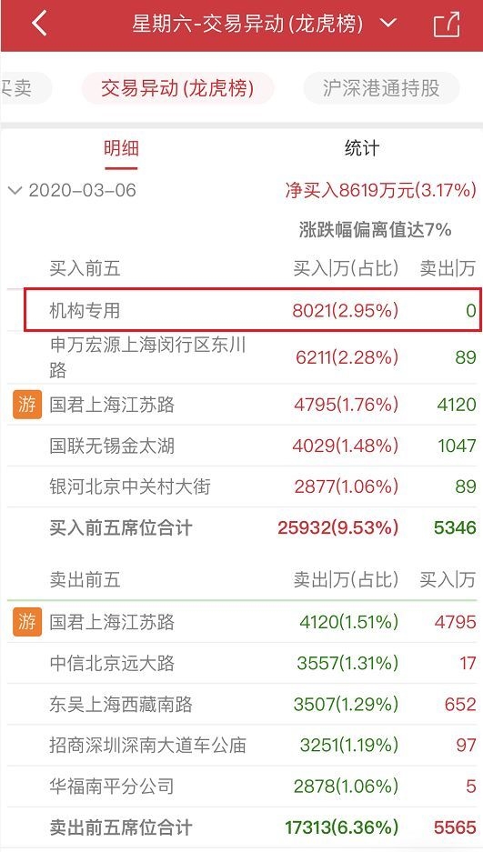 3月6日盘后交易数据显示,星期六在股价天地板中的换手率高达20%,同时买一席位为机构专用席位,买入金额达到8020万元。