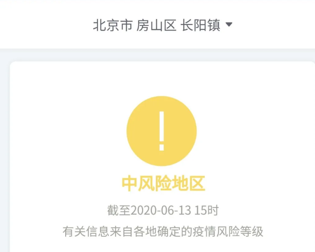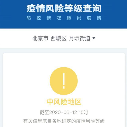 截至6月13日15时,国务院疫情风险等级查询系统显示,北京西城区月坛街道、北京市丰台区西罗园街道和花乡地区、房山区长阳镇被列为中风险地区。