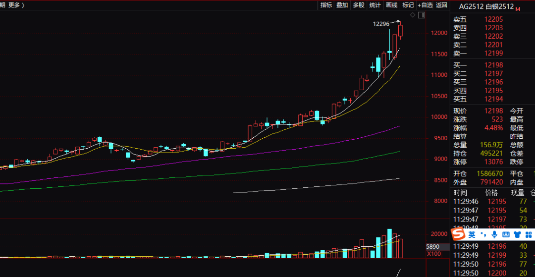 行情数据显示,今天上午,国内期货市场中,上海期货交易所白银期货主力合约暴涨,突破12000元/千克,创出历史新高,盘中涨幅一度超过5%。今年10月以来,上海期货交易所白银期货主力合约累计涨幅已经超过一成,今年以来白银期货主力合约累计涨幅已经超过六成。