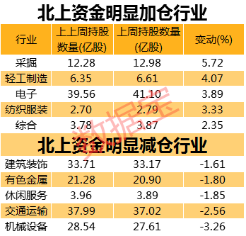 证券时报·数据宝统计显示,上周北上资金持股数量环比增加行业有16个,采掘、轻工制造、电子、纺织服装等行业持股数量环比增加3%以上。其中,采掘行业环比加仓最为明显,北上资金上周末持有该行业12.98亿股,环比增加5.72%。