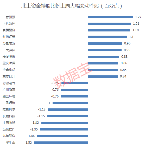 上周北上资金加仓股共583只,加仓比例超0.5个百分点的有32只。具体来看,香飘飘加仓比例最为明显,最新持股比例4.53%,环比增加1.27个百分点;紧随其后是上机数控,持股比例环比增加1.21个百分点;其他加仓比例靠前的还有赛腾股份、红塔证券、苏垦农发、大参林、宏发股份等。