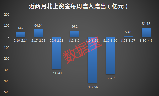 北上资金上周流入加速,一周累计净买入81.48亿元,创近两月以来的新高,其中沪股通净买入33.92亿元,深股通净买入47.56亿元。