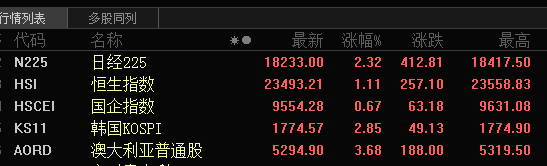 亚太股市早盘全线上涨,日经225指数涨幅超2%,澳大利亚普通股指数上涨3.5%,恒生指数涨超1%。而新加坡富时中国A50指数涨幅在1%。