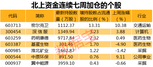 从市场表现来看,北上资金连续七周的加仓股中,上周4股股价上涨,密尔克卫涨幅最大,上涨10.38%,其他涨幅较大的还有中原环保等。跌幅较大的有基蛋生物等。