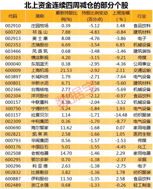 从北上资金减持股来看,罗牛山减仓最为明显,持股比例下降1.52个百分点,减仓幅度较大的还有丸美股份、远光软件、庄园牧场、长城科技等。