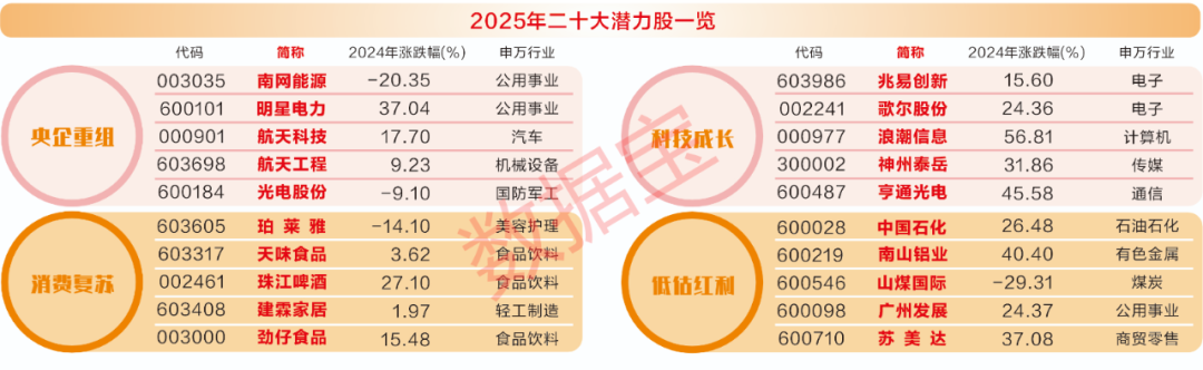 综合机构关注度、业绩、板块内相对估值以及均衡配置等角度,数据宝优中选优,推出2025年二十大潜力股(以下简称“潜力股”),包括5只央企重组概念、5只科技成长股、5只消费绩优股以及5只低估值红利股。