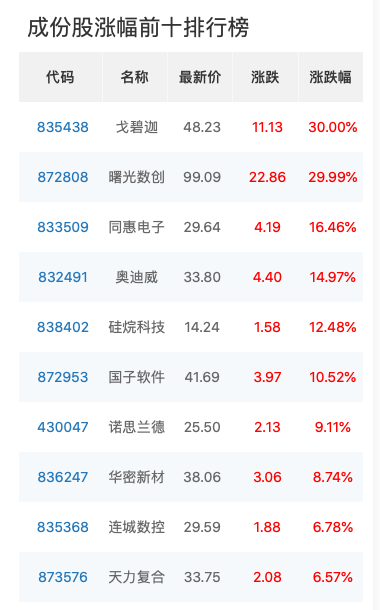 个股方面,当天,戈碧迦(835438.BJ)、曙光数创(872808.BJ)涨停,同惠电子(833509.BJ)等其余4股涨超10%。成交额方面,曙光数创达15.55亿元,艾融软件、并行科技分别为10.84亿元和10.45亿元。