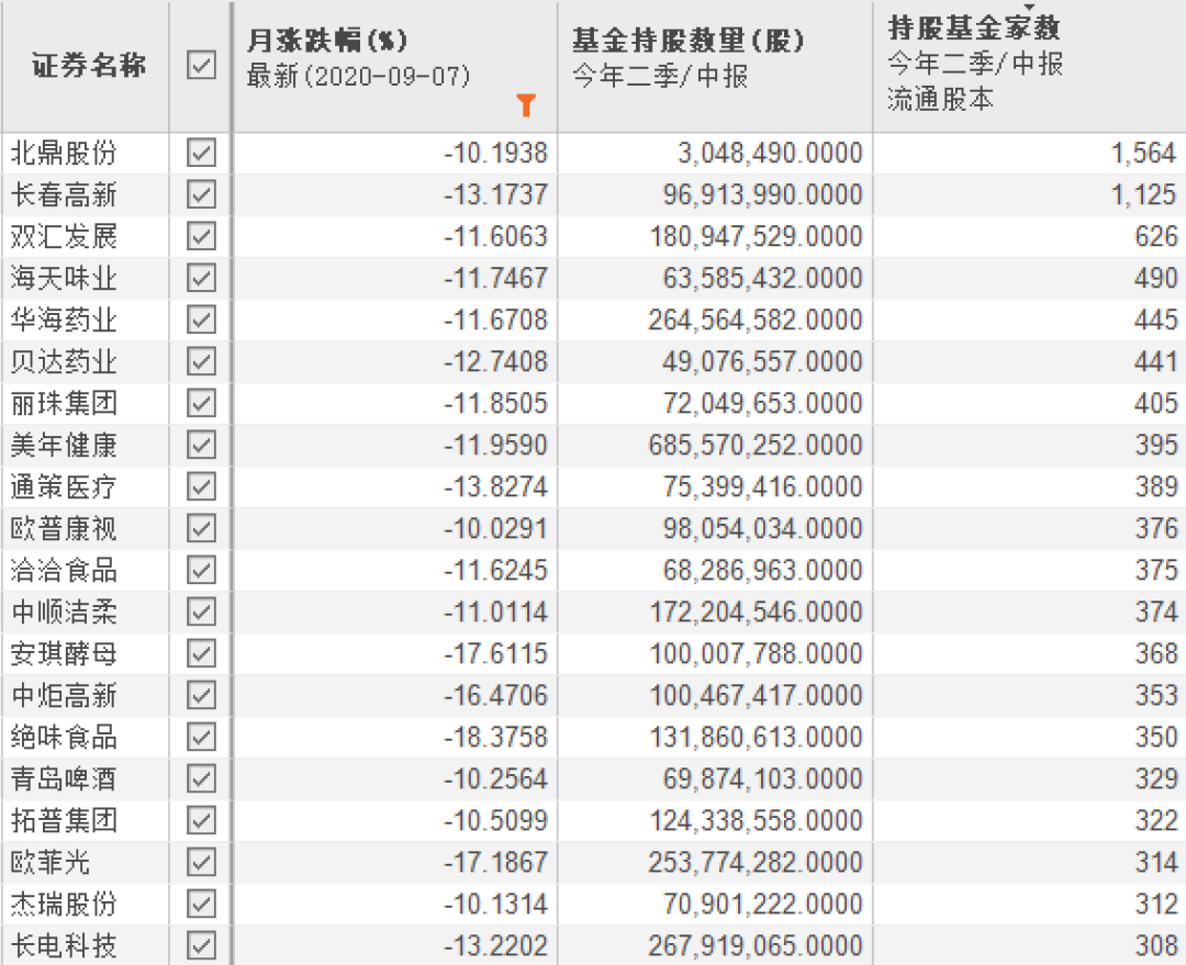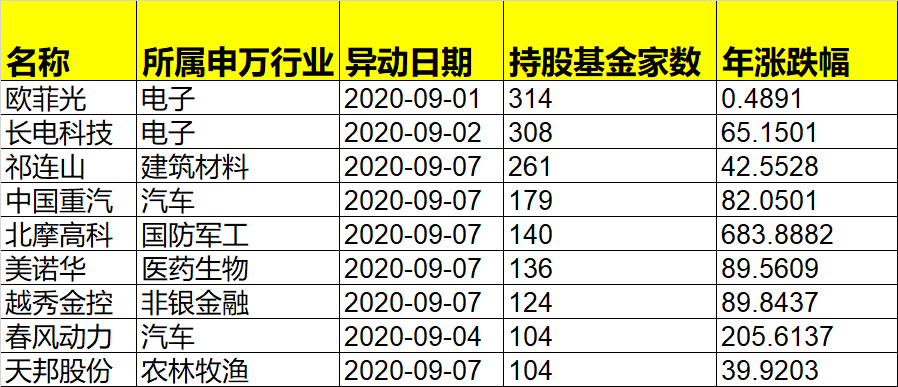 不仅如此,9月以来,受各种因素影响,欧菲光、长电科技等多只基金重仓股也登上跌幅龙虎榜。