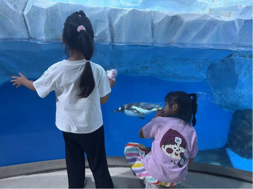 青岛极地海洋世界,小朋友在观赏企鹅 图片来源:财联社记者/摄