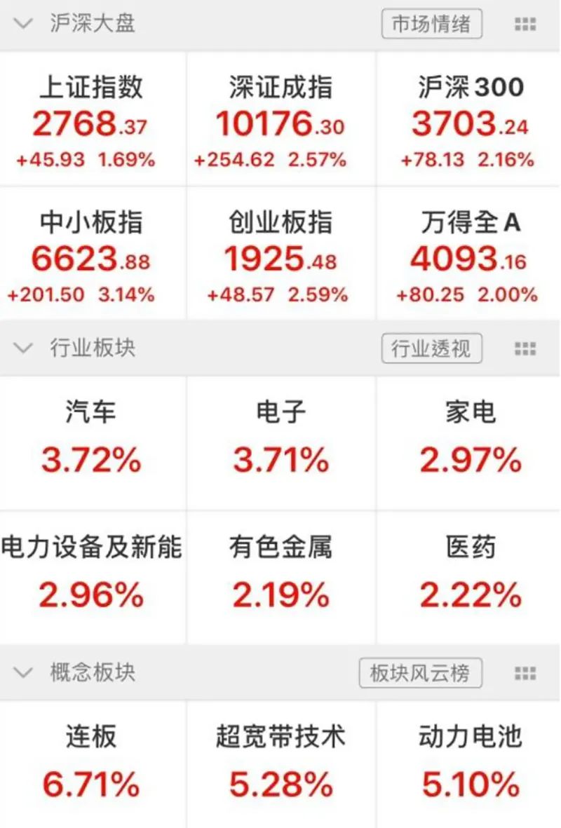 截至发稿时,上证指数报收于2768.37点,上涨1.69%;深证成指报收10176.30点,上涨2.57%;创业板指报收1925.48点,上涨2.59%。