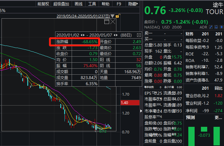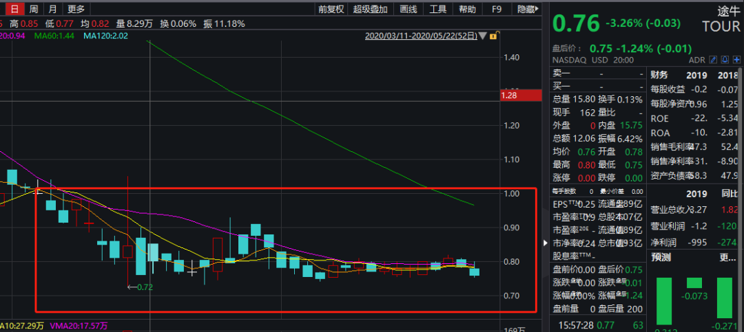 截至2020年5月24日,途牛股价为0.76美元,市值不到1亿美元。