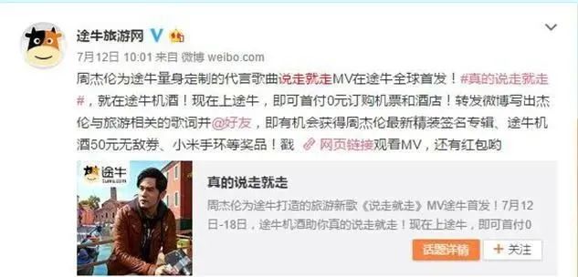 值得一提的是,途牛旅游网曾经有两大男神代言:一个是周杰伦,2016年,作为途牛代言人的周杰伦曾给途牛创作了一首主题曲叫《说走就走》: