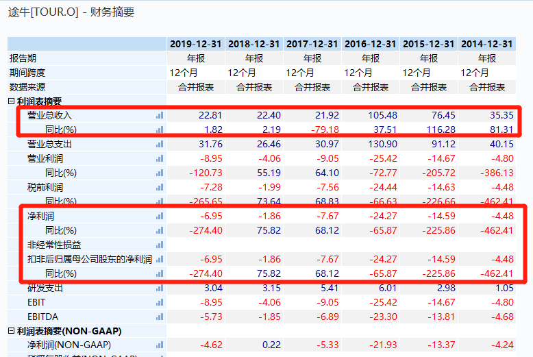 途牛2014年、2015年、2016年、2017年、2018年净亏损分别为4.48亿元、14.59亿元、24.27亿元、7.7亿元、1.86亿元。这意味着途牛上市6年亏损近60亿元。