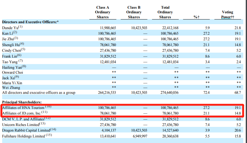 截至最新财报资料显示:截至2020年一季末,海航集团持有27.2%的股权,有19.1%的投票权,为大股东,海航有19.2%投票权;京东持有21.1%股权,有14.8%的投票权,为第二大股东。