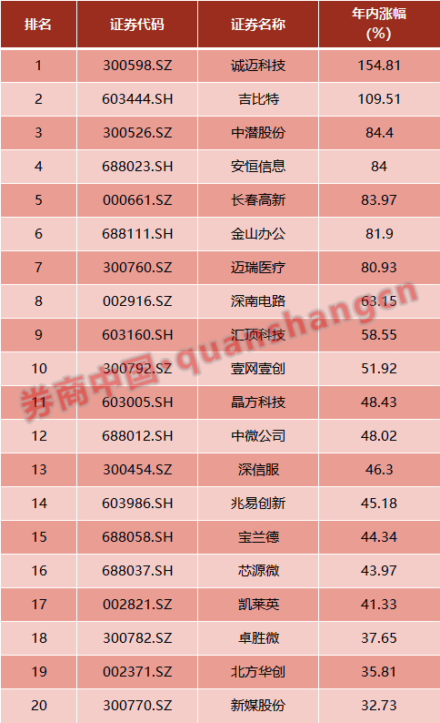 尽管市场整体低迷,仍有一批个股表现出色。剔除今年新股,涨幅榜排名前20名的个股涨幅均超过30%,其中诚迈科技(300598)和吉比特(603444)年内已经翻倍。