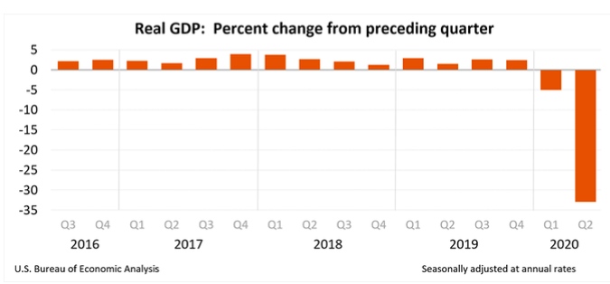 北京时间7月30日20时30分,美国二季度GDP携手初请失业金人数重磅来袭。数据显示,美国二季度实际GDP年化季率环比初值下滑32.9%,创历史最大降幅,预期下滑34%,前值为下滑5%。CNBC报道中称,金融危机最严重期间,美国的GDP曾环比萎缩8.4%,此外,1985年,美国GDP曾出现过10%的萎缩。
